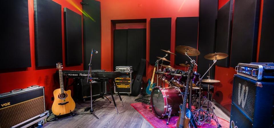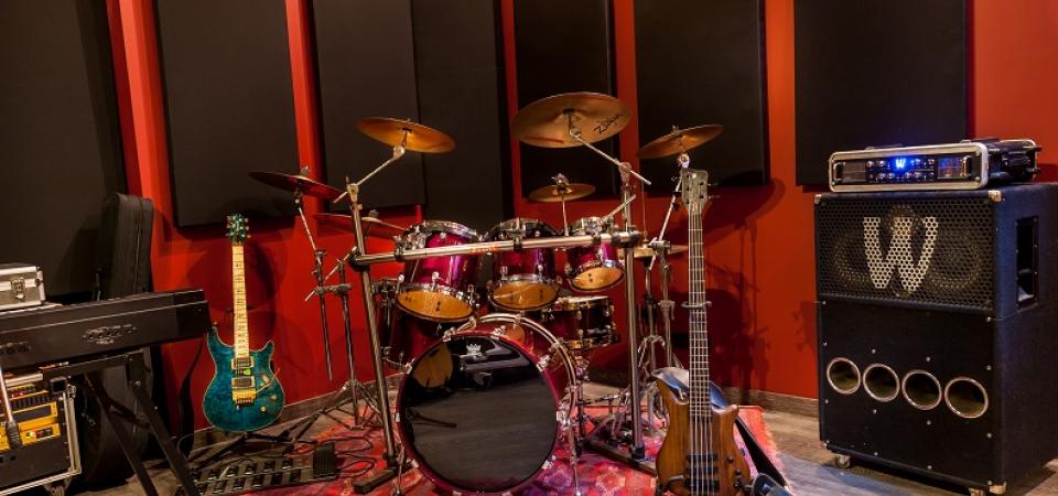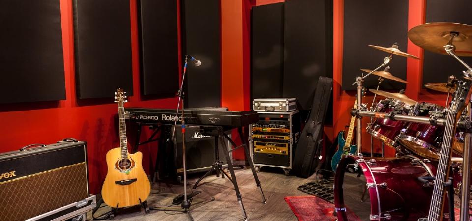 Iluminação natural e paredes pintadas em tons de Bordeaux para impulsionar a criatividade musical.