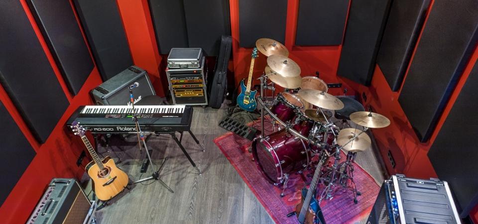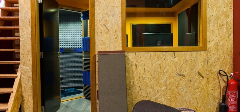 3 paredes com painéis de absorção acústica de frequências médias/altas, e absorsores de frequências graves aos cantos, perfazendo um índice de absorção acústica de 45%. Ideal para gravação de baterias acústicas e actos ao vivo.